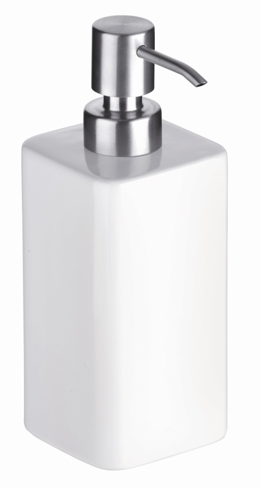 Tillverkad i vit keramik med pump i rostfritt stål. Pumpen är 18 cm hög och mäter 6,5 x 6,5 cm.