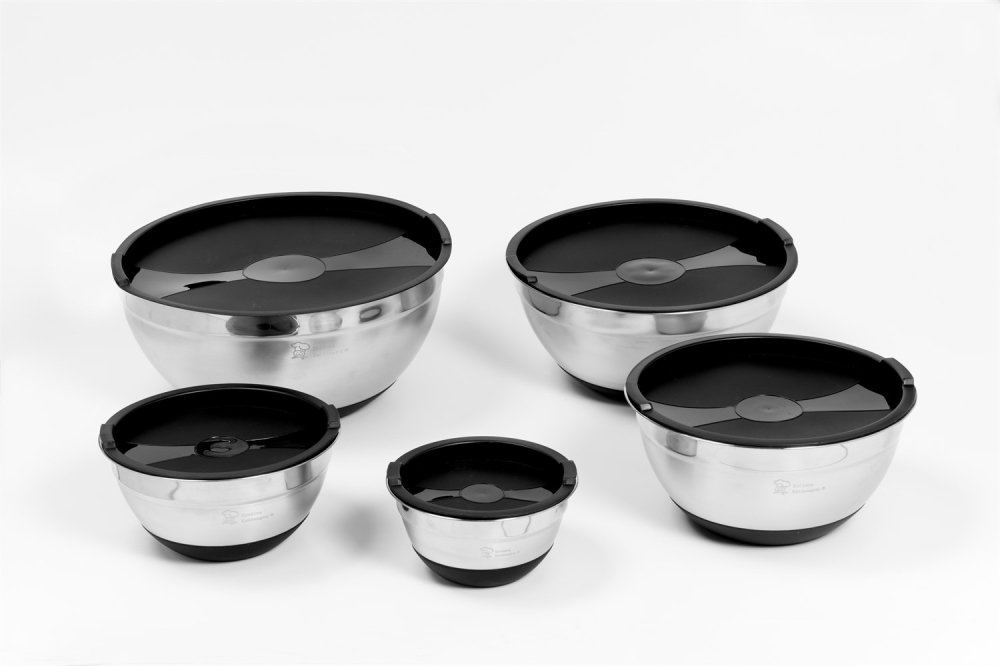 Alla skålar har också en halkfri silikonbotten, vilket gör att skålen står stadigt på bordet när du t.ex. ska vispa innehållet med en handmixer.