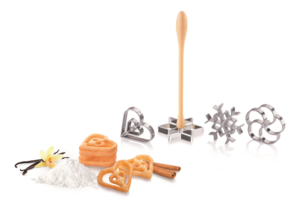 Du kan själv göra de läckra krispiga och kryddiga kakorna med detta smarta Rosettejärn. Kakorna friteras med detta Rosettejärn, de smakar underbart och påminner om belgiska våfflor. Men något mer eleganta och lätta i konsistensen. Det finns formar för att göra 4 olika former på kakorna.