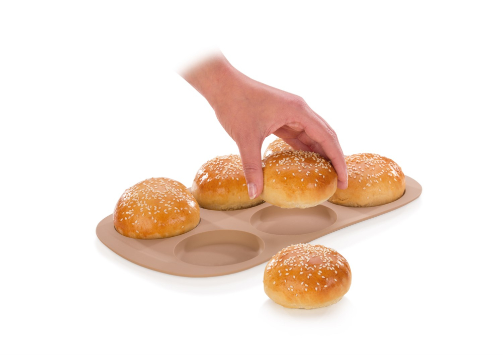 Silikonform för tillverkning av 6 burgerbullar. Hålen mäter Ø9,0 cm.
