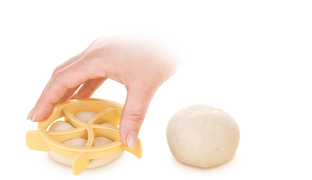 Du trycker formen djupt ner i degbollarna, dvs. ca. 2 cm över underlaget, och bakar sedan brödet.