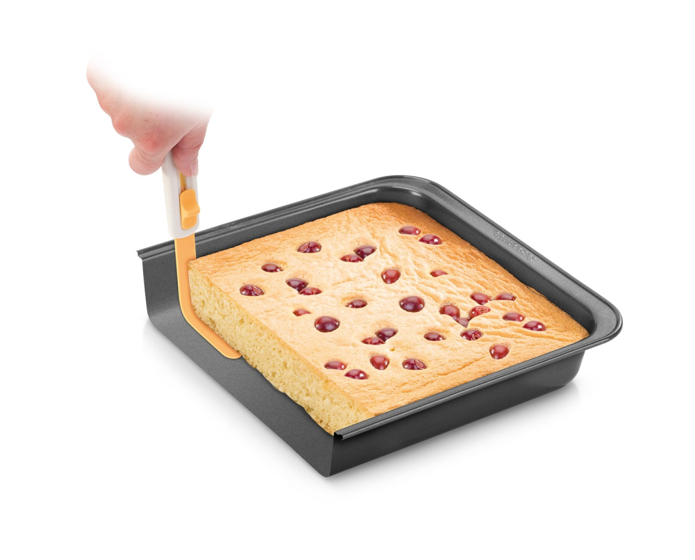 Denna spatel som är böjlig är faktiskt formad som en kniv så den lätt följer din långpanna och lossar kakan runtom