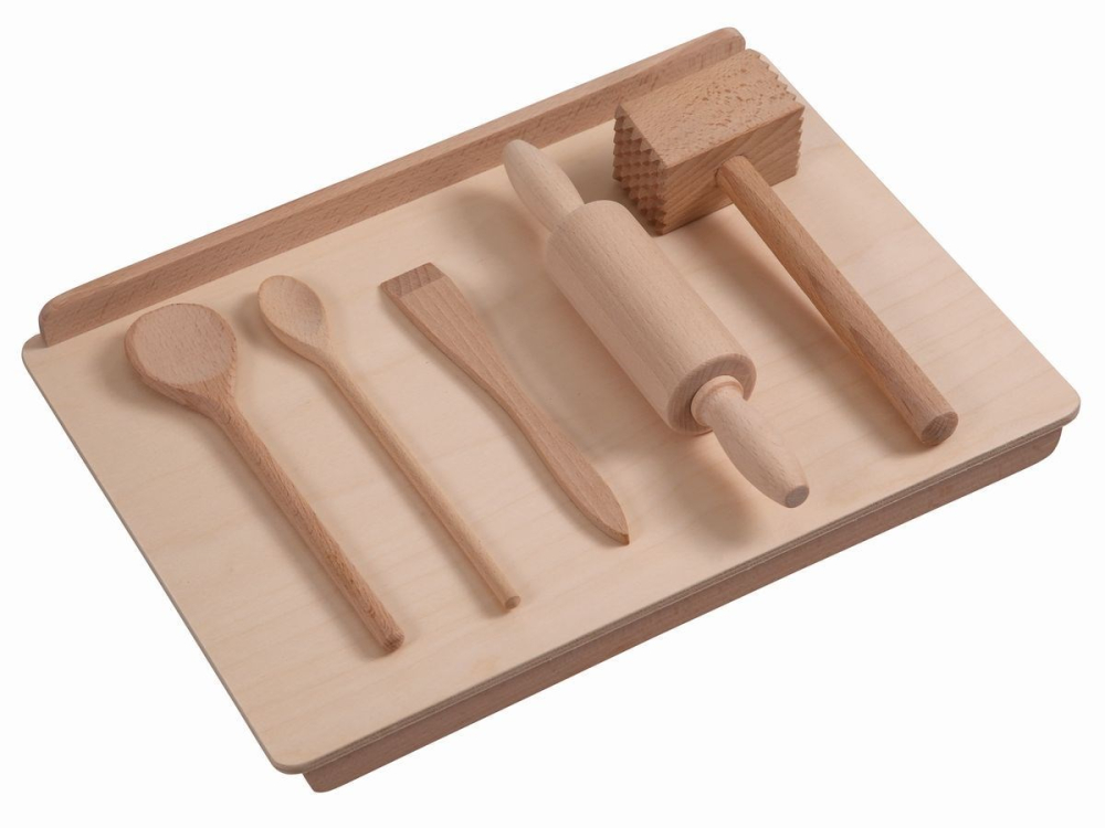 Köksetet för barn består av 2 grytsslevar i olika former, 1 spatel, 1 kavel, 1 köttklubba och 1 arbetsplatta