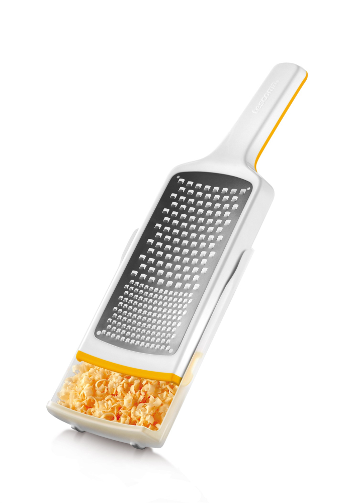 Detta rivjärn med uppsamlare gör det lätt att riva fint riven parmesan, citronskal, choklad, muskotnöt, ingefära, vitlök, nötter, färsk pepparrot osv. Skyddsskyddet fungerar också som ett reservoar för de rivna ingredienserna. De extra skarpa, motståndskraftiga bladen är av rostfritt stål av hög kvalitet.