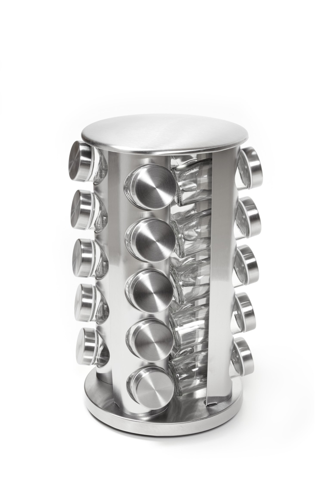 Kryddkarusellen har 20 glas med kromfärgad topp och sitter i en karusell på vridbar fot, så den är lätt att komma åt.