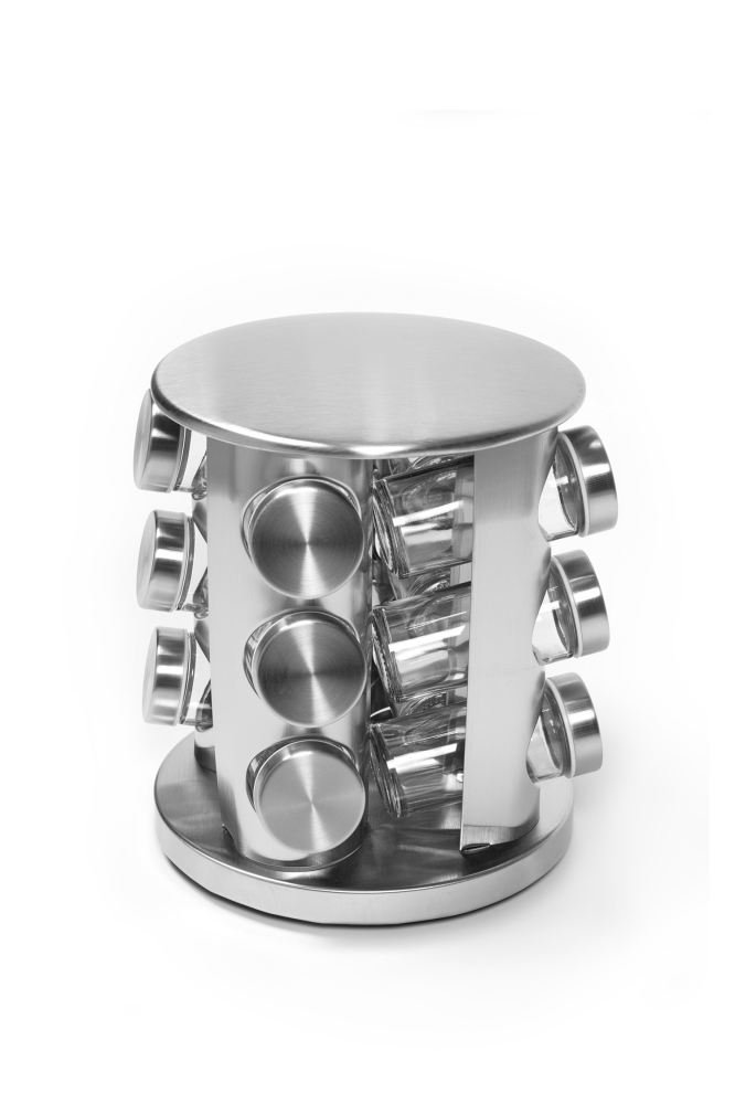 Kryddkarusellen har 12 glas med kromfärgad topp och sitter i en karusell på vridbar fot, så den är lätt att komma åt.