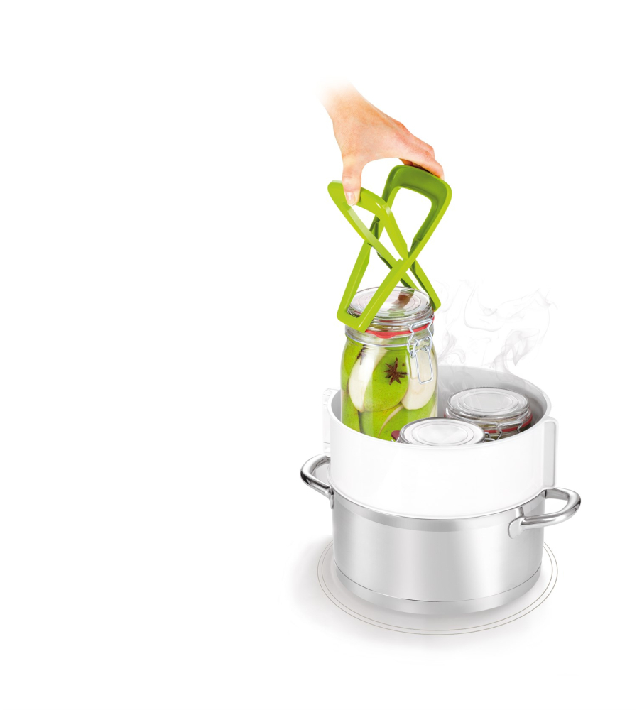 Med denna tång kan du säkert ta bort varma glas och burkar av alla vanliga storlekar från konserveringsgrytan och enkelt flytta dem till bordet. Lämplig för burkar med skruvlock och flip-top lock. Tillverkad av värmebeständig plast av hög kvalitet.